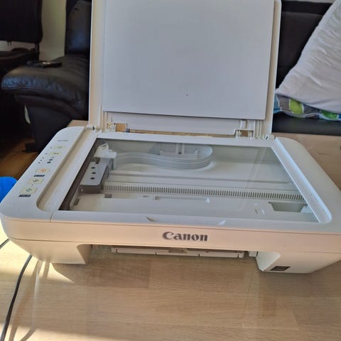 Canon multifunktionsprinter i sort. Enheden har fladbed-scanner i toppen og frontindføring til papir. Der er udtrækkelig papirbakke foran samt bageste papirholder. Egnet til udskrivning og scanning af dokumenter og billeder i hjemmet eller på et lille kontor. Tilslutning via kabel (ses på billederne). Modelbetegnelse og øvrige specifikationer fremgår ikke tydeligt af billederne.