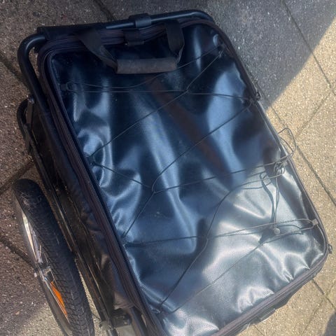 Cykelanhænger med rektangulær trækasse og metalforstærkninger. Anhængeren har to hjul med dæk og skærme samt trækstang til montering på cykel. Trækassen er udført i træ med metalhjørner og refleksfelter bagpå.