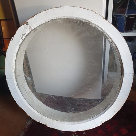 Diameter 71cm. Rundt dobbelt lags glas fra vindue. Til en god idé. Skal bare pudses :)