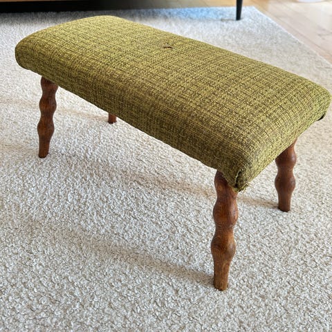 Fin lille retro/vintage fodskammel med fine detaljer. Ben i træ (tror det er teak) og messingfødder og kantbånd ved puden.