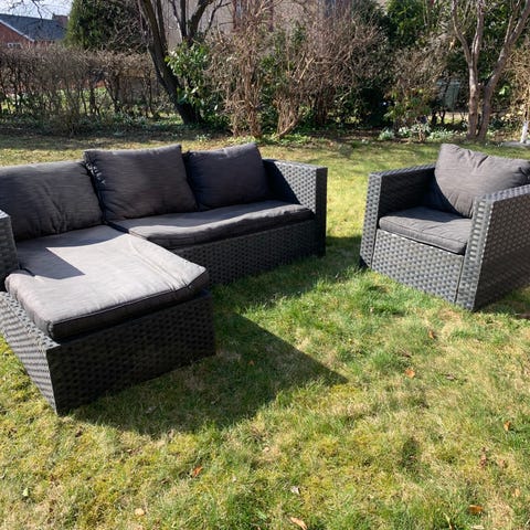 Havesæt loungesæt med sofa, loungestol og bord i sort polyrattan med grå hynder