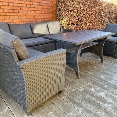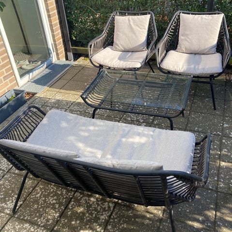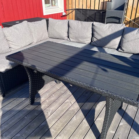 Havesæt loungesæt bestående af sofa, loungestol med chaiselong og rektangulært sofabord. Sættet er udført i sort polyrattan med løse grå hynder på sæder og ryglæn. Sofabordet har glasplade på toppen. Egnet til brug på terrasse, altan eller i have som udendørs siddegruppe.