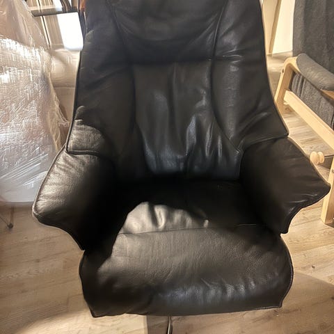 Kroken lænestol i sort læder med fodskammel.