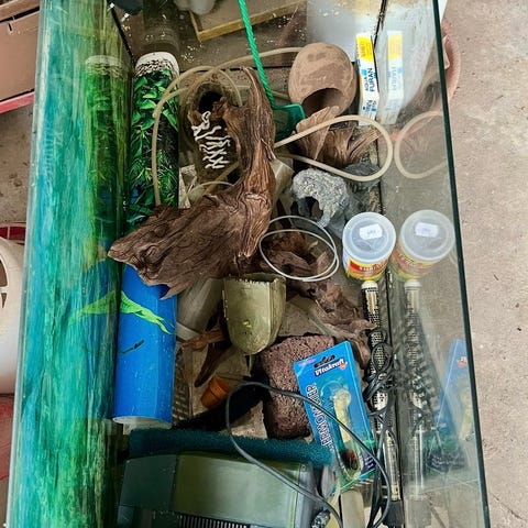 Akvarium med sort armatur L 60 cm H 32 cm D 30 cm. I akvariet medfølger diverse tilbehør, herunder vandbehandlingsprodukter, testudstyr, dekorationer og andre akvarieartikler, 60 liters akvarium