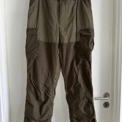 Jagt- og outdoor sæt bestående af jakke og bukser i grøn farve. Sættet har flere lynlåslommer på jakken samt justerbare manchetter og kant. Bukserne har forstærkninger og flere lommer samt justerbare benafslutninger med stropper, der kan spændes omkring støvlerne. Egnet til jagt, vandring og andet friluftsbrug i skov og kuperet terræn. Kun brugt 2 gange og er som nyt!