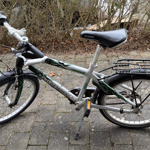 Kildemoes børnecykel med 20" hjul i farverne grøn og sølv. Cyklen har lige styr, kædeskærm og bagagebærer. Udstyret med reflekser på hjulene og standardpedaler. Egnet som hverdagscykel til børn i den størrelse, der passer til 20" hjul.