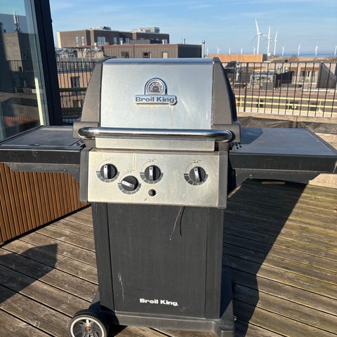 Broil King gasgrill med fire brændere, rotisseri og sidebrænder. Mangler et hjul og trænger til nye riste. Gasflaske medfølger ikke.