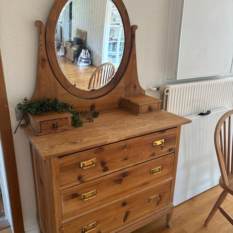 Chartol - Kommode med spejl i lyst fyrretræ. Møblet har en stor, oval spejlsektion monteret på bagstykket og to små skabe med låger på hver side af spejlet til opbevaring af mindre genstande. Nederst er der to brede skuffer, som giver ekstra opbevaringsplads til tøj eller andre ting. Skal afhentes fra tredje sal.