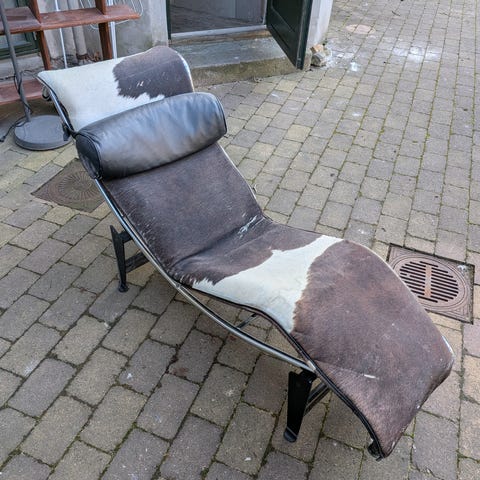 Sort læderpude med krom, samt sortlakeret stel. Replikamodel af LC4 Loungestolen fra Cassina, designet af bl.a. Le Corbusier. Vinklen på stolen kan nemt justeres.