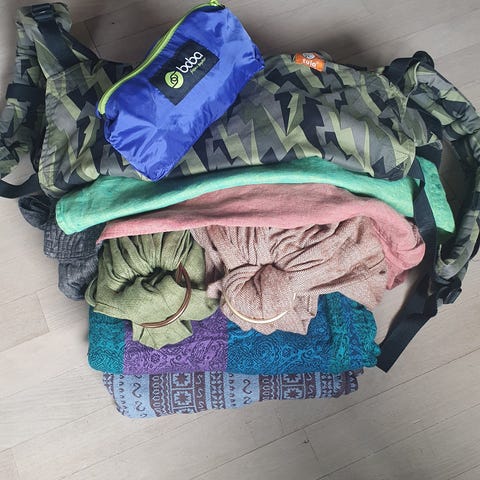 Mai tai bæresele/vikle i stof med bredt taljestykke og lange skulderstropper til knude- eller viklelukning. Bæreselen er hjemmesyet med god polstrene. Egnet til at bære barn foran eller på ryggen, afhængigt af barnets alder og behov.