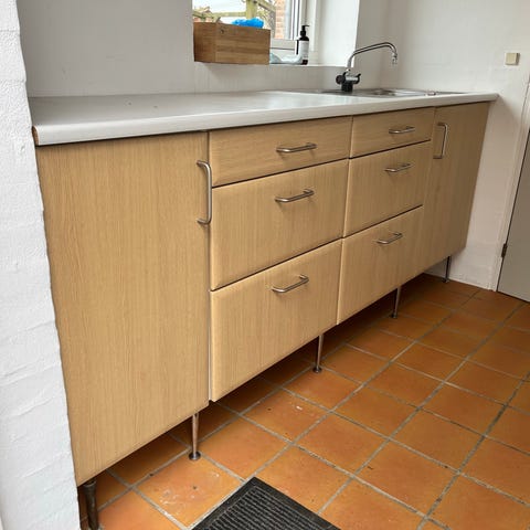 Skabe, bordplade, vask og armatur medfølger! IKKE hårde hvidevarer