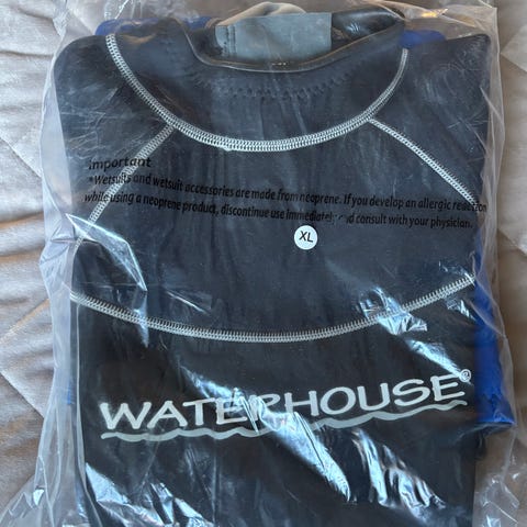 Waterhouse våddragt. Våddragten er i en mørk farve med lyse kontrastsyninger og lynlås. Egnet til brug ved vandsport og andre aktiviteter i koldt vand, hvor der er behov for isolering og bevægelsesfrihed.