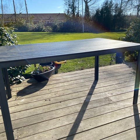 Havebord i træ i rektangulær form. Bordet fremstår i en gråpatineret træoverflade, typisk egnet til udendørs brug på terrasse eller i have. Velegnet som spisebord eller arbejdsbord i haven. Mærkeplade ses på langsiden af bordet, men mærke og model fremgår ikke tydeligt af billederne.