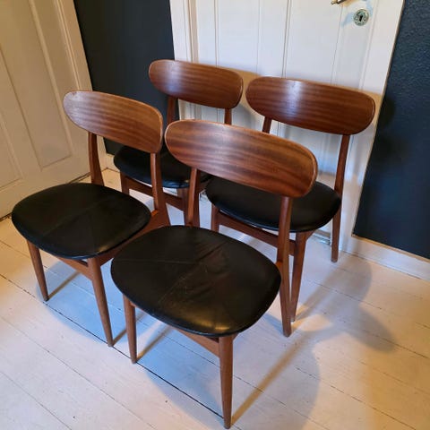 4 stk teaktræs stole med sort læder.