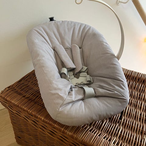 Trip trap stol i lys natur, i rigtig fin stand. Incl babybøjle med læderstrop.