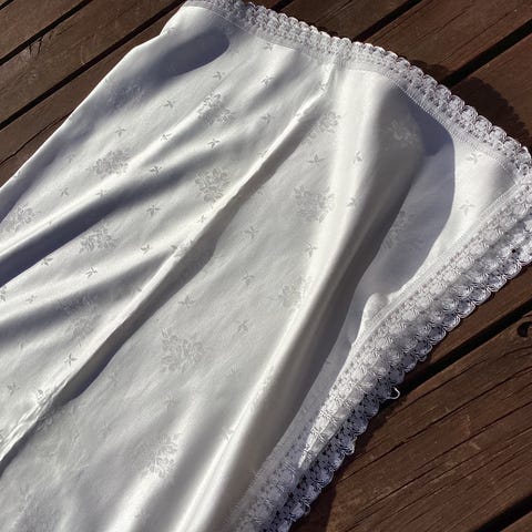 Ældre hvid oval dug med hæklet tunger, kanter, mønster.