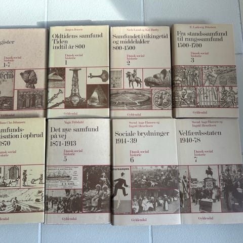 16 bind med Gyldendal og Politikens "Danmarks Historie" bogsæt. Serien består af flere bind, der kronologisk gennemgår Danmarks historie fra oldtid til nyere tid. Hvert bind behandler en bestemt periode med tekst, illustrationer og fotos. Velegnet som opslagsværk eller samlet historisk fremstilling af Danmarks udvikling gennem forskellige tidsaldre.