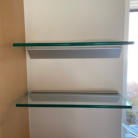 Elegant glashylde som hænger i diskret aluminiumsskinne.