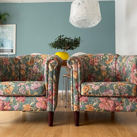 Vintage loungestol / lænestol i farverigt blomstret stof