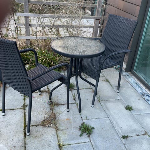 Cafésæt bestående af rundt bord og to stole i fletlook. Stolene har armlæn og leveres med grå hynder. Sættet er egnet til udendørs brug, f.eks. på altan, terrasse eller i haven.