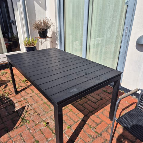 Udtræksbord str. L200xB95xH77 cm i sort aluminium med sorte nonwood lameller og 4 stk. stole i grå polyrattan flet med indstillelig ryg. Der medfølger 1 stk. tillægsplade på 50 cm og 4 stk. lysegrå hynder. Sættet har stået på overdækket terrasse. Prisen er fast og betaling modtages kun via Mobilepay. Kan afhentes i Taastrup efter aftale.