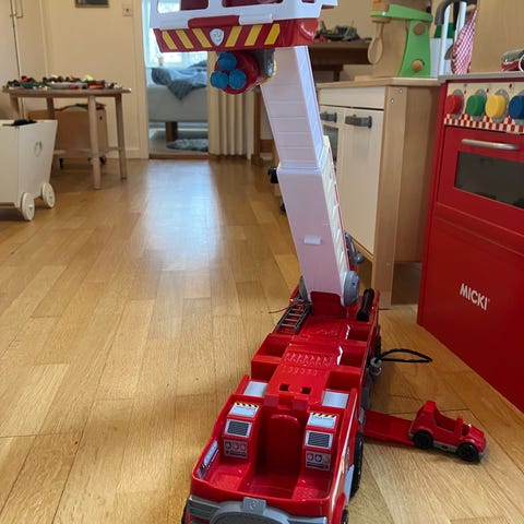 Paw Patrol brandbil med Marshall figur som legetøjskøretøj. Køretøjet er udført i rød og grå plast med detaljer som stige og hjul. Marshall-figuren kan tages af og placeres i førersædet. Egnet som legetøj til børn, der kan lide Paw Patrol-universet og køretøjsleg.