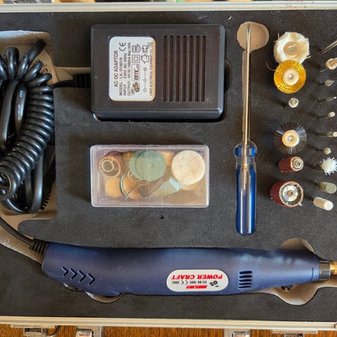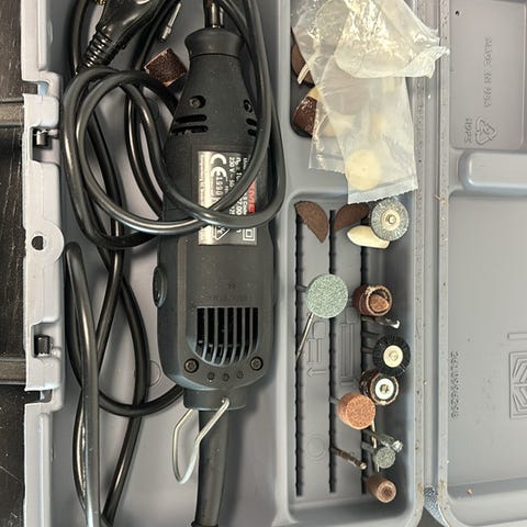 Dremel 7750 multiværktøj med oplader og omfattende tilbehørssæt. Sættet indeholder et trådløst Dremel 7750 rotationsværktøj samt en plastkuffert med en række forskellige tilbehørsdele, herunder slibesten, polerskiver, skæreskiver, bor og andre småbits. Der medfølger desuden en mindre plastboks med ekstra tilbehør. Velegnet til præcisionsarbejde som slibning, polering, gravering og mindre hobbyopgaver i forskellige materialer.