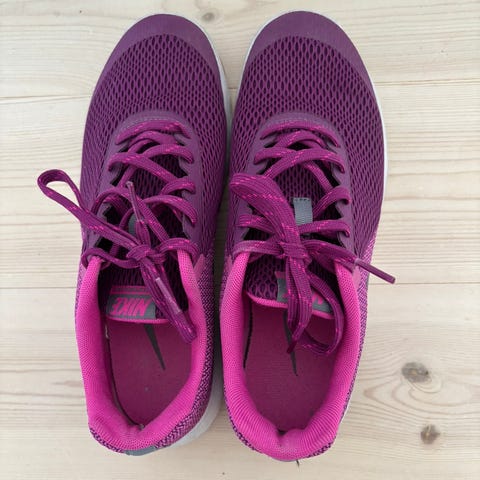 Kyaoba sport sneakers træningssko i str. 38. Skoene er i bordeaux med pink detaljer og hvid sål. Overdelen er i åndbart mesh-tekstil med snørelukning. Ydersålen er i gummi med mønster for greb. Indersiden er polstret for komfort under brug. Velegnet til fitness og anden let træning samt hverdagsbrug. Kun brugt indendøre, der er lidt brugsspor i syningen (billede 3)