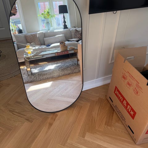 IKEA spejl med sort, dekorativ ramme. Rammen har udskårne detaljer langs kanterne, som giver et klassisk udtryk. Spejlet kan bruges både stående op ad en væg eller ophængt, afhængigt af behov og montering. Velegnet til fx entre, stue eller soveværelse som helkrops- eller vægspejl.