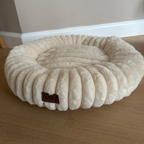Rund kæledyrsseng i lyserød plys. Sengen har høj, blød kant og fyld, der giver støtte hele vejen rundt. Undersiden er udført i mørkt, skridsikkert materiale, som hjælper sengen med at ligge stabilt på gulvet. Velegnet til mindre hunde eller katte, der kan lide at ligge blødt og omsluttet.