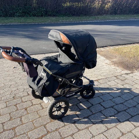 Der følger ekstra sæt terræn hjul med, regnslag, pusletaske, seler, pude til at sidde op, kopholder, sovepose