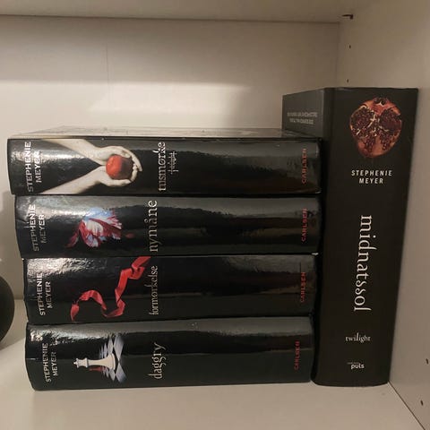 Twillight saga bøgerne 1-4. Paperback, og dansk udgave. Tusmørke (bog 1) er læst 1 gang, resten er urørt. Er flyttet 1 gang, og har ellers stået I et skab