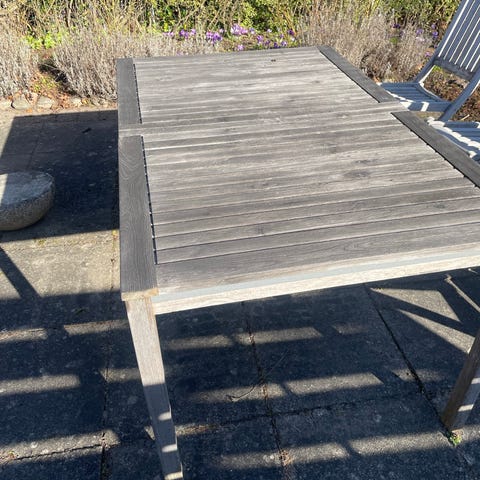 Rektangulært havebord i hvidt træ med lamelbordplade. Bordet har hul i midten af bordpladen til parasol. Velegnet til udendørs brug på terrasse eller i have.