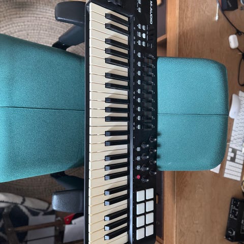 Alesis V61 MIDI-keyboard med 61 anslagsfølsomme tangenter i sort. Controlleren har otte pads, drejeknapper og faders til styring af softwarefunktioner. Velegnet til brug med musikproduktionssoftware via computer som USB-MIDI-controller til indspilning og programmering af lyd og musik.