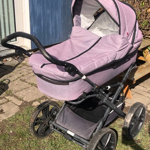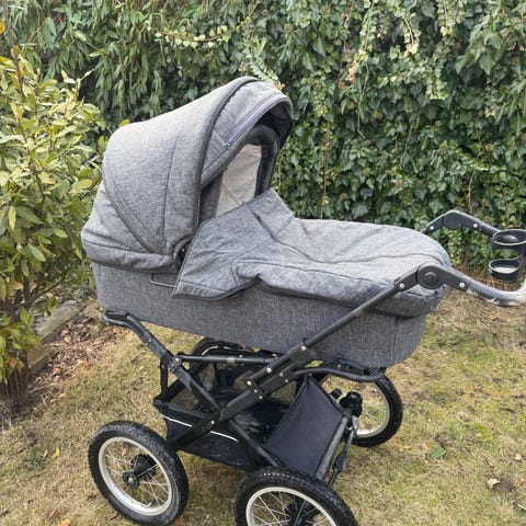 Odder North barnevogn i sort. Klassisk barnevogn med langt liggemål og justerbart styr. Vognen har fire store hjul og indkøbskurv under vognen. Indersiden er lys og polstret for komfort til barnet. Velegnet til daglige gåture og transport af spædbarn/barn i liggende position. Vognen er fra 2021 og kun brugt til et barn. Har stået indendørs når den ikke har været i brug og stået under carport når der blev sovet. Madras (kapok) beskyttelsesmadras (kapok) og lagen (allergivenligt økologisk bomuld) fra N’Sleep medfølger sammen med siddestøtte, regnslag og solskærm.