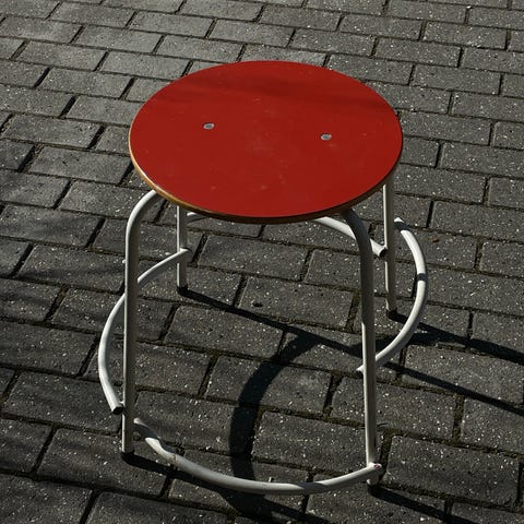Skamler med tre ben. Sæderne har brugsspor i form af mindre hakker i fineren. Ellers er de stabile og fine. Gummidutter på benene er intakte.