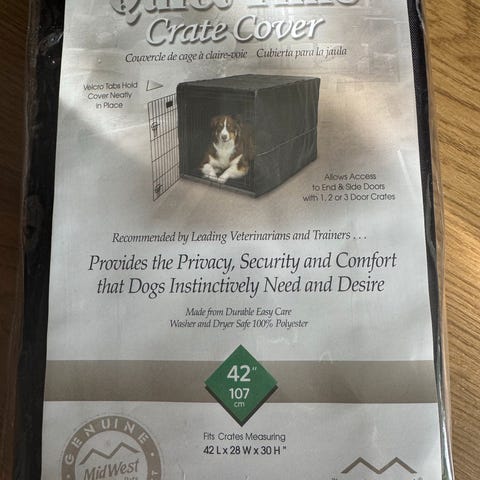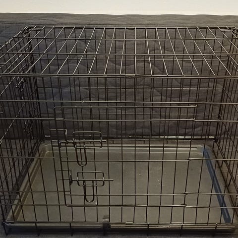 Størrelse L49,5 x H35 x B34,5. Kan klappes sammen. Er helt ubrugt, vores hund var for stor.