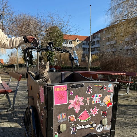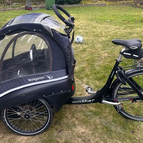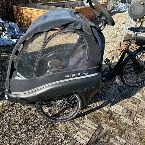 Cyklen står flot og alt fungerer. Den er opgraderet med de populære Schwalbe Marathon Plus dæk. Kaleche er nem at tage af og på. Lynlås er smurt jævnligt og fungerer som den skal.