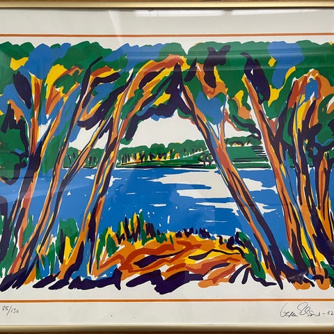 3 Gorm Eriksen litografier fra samme serie. Fra 1985, nummer 43 ud af 100. Motiv af landskab med træer, farverig og grafisk stil.
