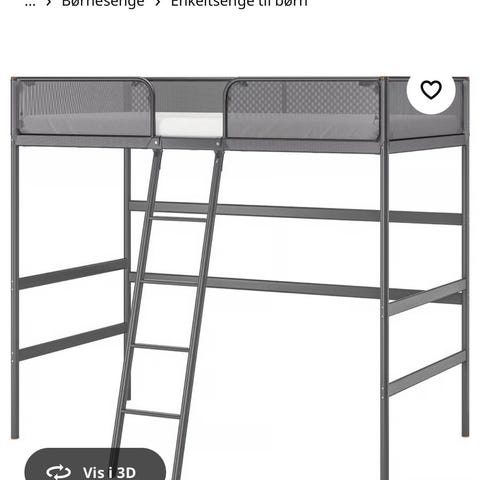 IKEA højseng i metal i grå farve. Sengen er hævet, så der er gulvplads under til fx opbevaring, skrivebord eller kommode. Adgang via stige i den ene ende og sengekant med gelænder hele vejen langs siden. Velegnet til børne- eller ungdomsværelse, hvor der ønskes ekstra gulvplads under sengen.