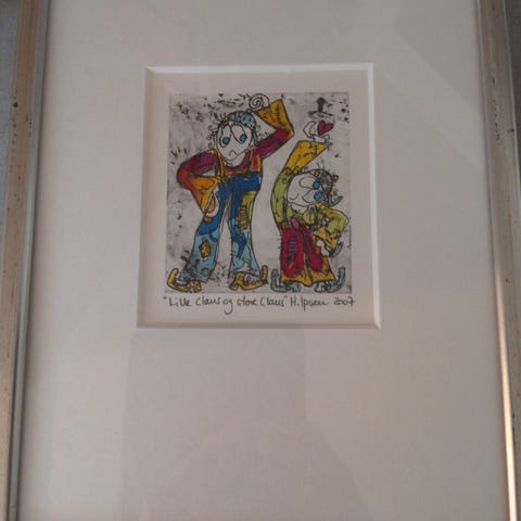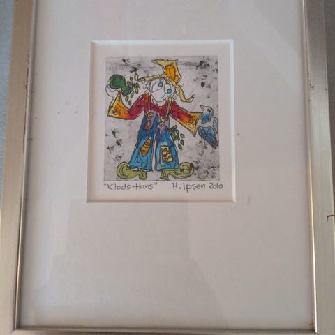 H. Ipsen "Klods-Hans" kunsttryk med ramme. Motivet viser en farverig figur med hat, fugl i hånden og store sko. Trykket er dateret 2007 og er monteret i passepartout. Rammen er i metal med lys overflade og har synlige brugsspor og misfarvninger flere steder. Velegnet som vægdekoration i stue, gang eller børneværelse.