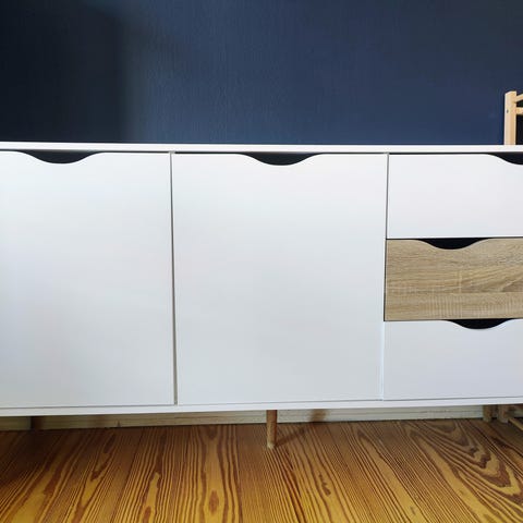 Flot skænk i eg/hvid fra Jysk med 3 låger og god opbevaringsplads.