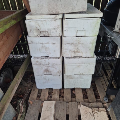 Gamle orange 40 kg plukkasser i metal.