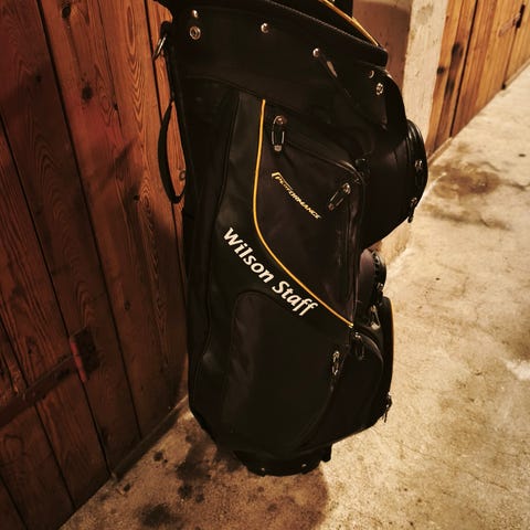 Wilson Staff golfbag i sort og grå. Baggen har top med individuelle rum til køller og flere lynlåslommer i siderne til opbevaring af tilbehør som bolde, tees og handsker. Velegnet til .brug på vogn eller trolley. Farvekombination i mørke nuancer med Wilson Staff-log på lommerne. 20 titleist søbolde og en pose tees kan du evt få med, hvis du opfører dig ordentligt 😃
