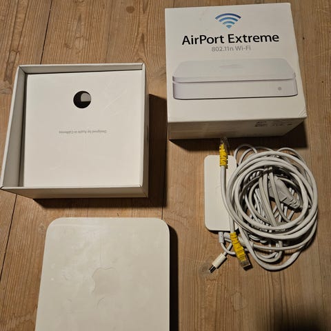 Apple AirPort Express router med 802.11n Wi‑Fi. Enheden fungerer som trådløs router til oprettelse eller udvidelse af et Wi‑Fi-netværk. Har indbygget strømforsyning med direkte stik til stikkontakt. Velegnet til brug i hjemmet eller på mindre kontorer til deling af internetforbindelse mellem flere enheder. Model A1392, fremstillet til EU-markedet ifølge mærkningen på emballagen.