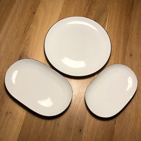 Motel a Miio 2 keramikfade med flotte glasurer. Ingen synlige fejl. Det lille fad er ca. 15 cm langt og 7 cm bredt. Det store fad er ca. 26 cm langt og 13 cm bredt.
