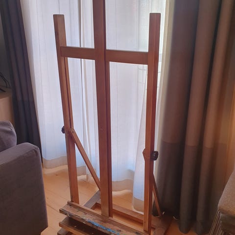 Staffeli i træ. Klassisk gulvstaffeli egnet til lærreder i forskellige højder. Staffeliet har justerbar midtersøjle og lærredsholder, så højden kan tilpasses. Velegnet til maleri, tegning eller udstilling af billeder i atelier, hobbyrum eller stue.