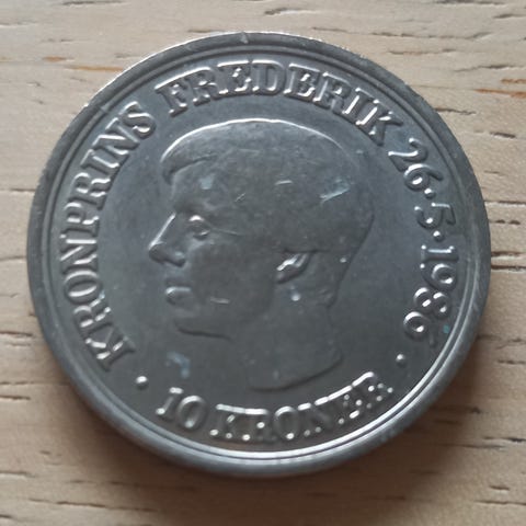 Danmark 10 kroner mindemønt med portræt af kronprins Frederik og dronning Margrethe II. Mønten er fra 26.5.1986 og leveres i kapsel i originalt etui med blå indlæg. Frederik 18 år sølv
