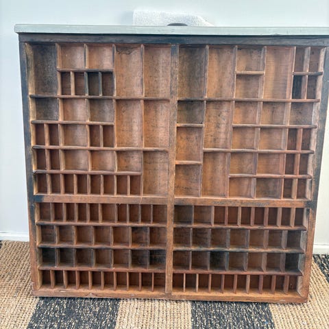 En smuk og velbevaret, gammel sættehylde i massivt træ med mange små rum. Perfekt til opbevaring af småting, smykker, perler, eller som en unik indretningsdetalje på væggen.