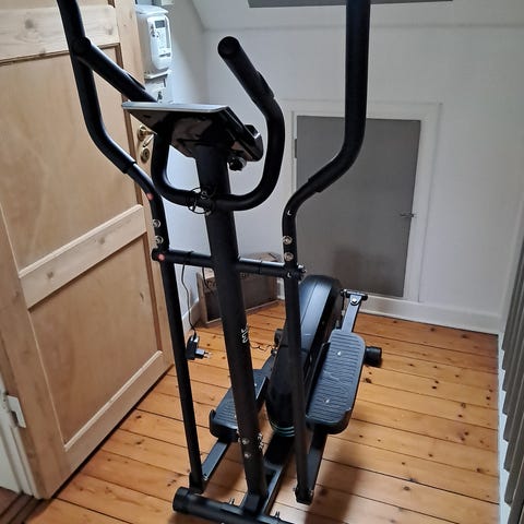 Titan Life Athlete C55 crosstrainer i blå og sort. Modellen har skridsikre pedaler og frontdrevet svinghjul. Konsollen viser blandt andet tid, distance og andre træningsdata via det indbyggede display. Velegnet til konditionstræning og helkropstræning i hjemmet.